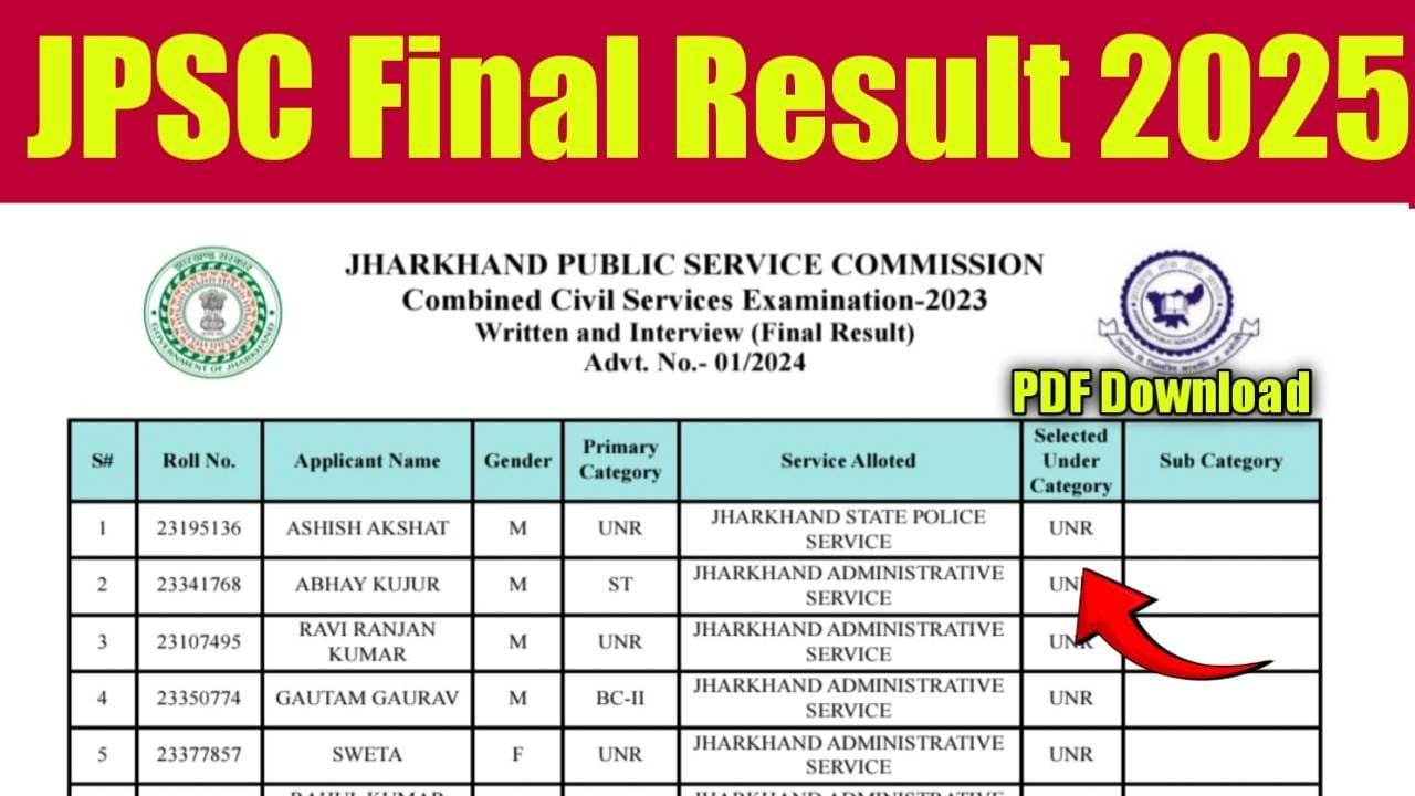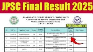 Jharkhand JPSC Civil Services Final Result 2023 की Final Merit List 25 जुलाई 2025 को जारी की गई है—342 उम्मीदवार चयनित हुए हैं, और अब आप official jpsc.gov.in वेबसाइट से Live PDF Download कर सकते हैं। जिसकी पूरी जानकारी हम ने इस आर्टिकल के माध्यम से बताया हुआ है। रिजल्ट चेक वा डाउनलोड करने के लिए आप के पास में Roll Number होनी चाहिए जिससे आप काफी आसानी पूर्वक से अपने रिजल्ट को चेक वा डाउनलोड कर सकते है।